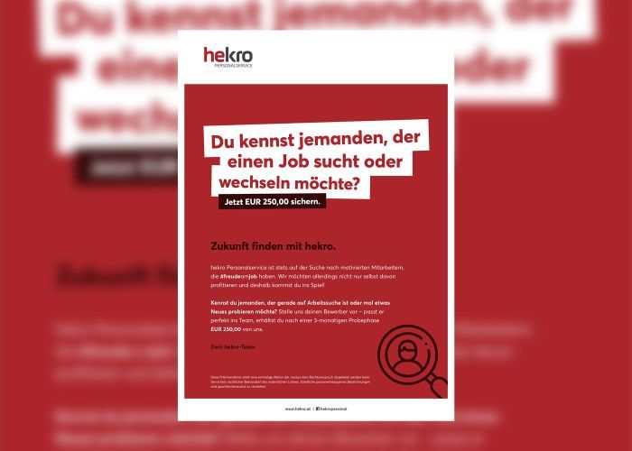 Wir suchen stets motiviertes Personal und bieten nun auch unseren MitarbeiterInnen die Möglichkeit, neues Personal für unser Unternehmen zu gewinnen. Empfehlen Sie uns weiter und verdienen Sie sich € 250,-- Vermittlungsprämie. Die Auszahlung der Prämie erfolgt, wenn die neue MitarbeiterIn 3 Monate durchgehend bei uns beschäftigt war.